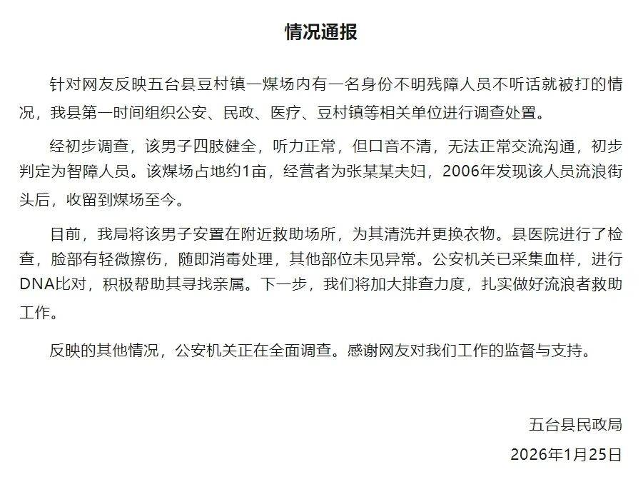 网友反映山西五台县一煤场内有身份不明残障人员不听话就被打官方通报:脸部有轻微擦伤公安已做DNA助其寻亲快3彩票投注与开奖数据查询