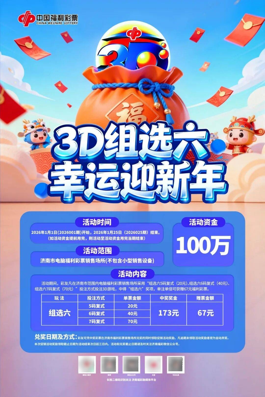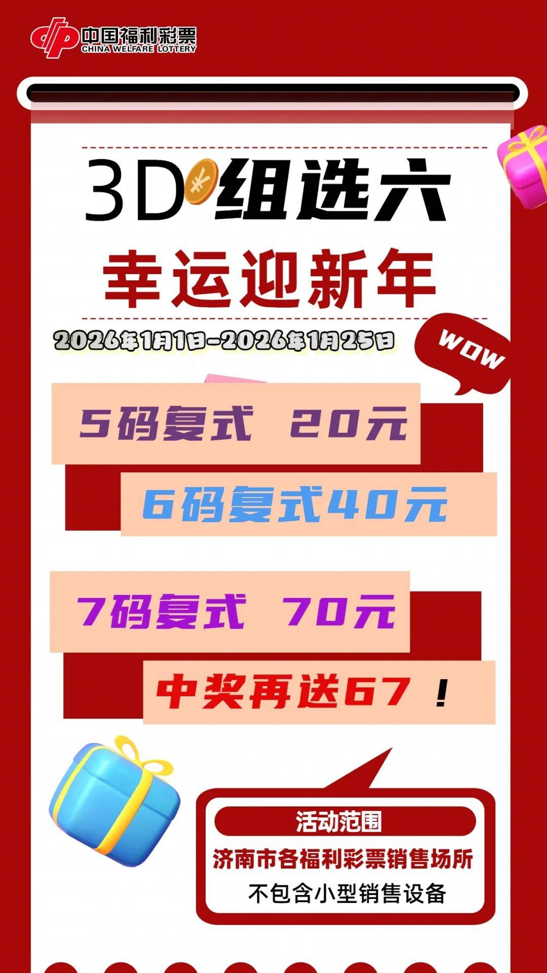 活动期间,彩友凡在济南市范围内电脑福利彩票销售场所采用“组选六5码复式(20元)、组选六6码复式(40元)、组选六7码复式(70元)”投注方式投注3D游戏,中得“组选六”奖项,单注单倍可获赠67元福利彩票。